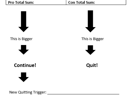A while back I wrote a post on making decisions like Benjamin Franklin. The decision-making process, or method, recommended by Franklin is to create a pros and cons list. You’re going to be creating a pros and cons list, using your “Knowing When to Quit Cheat-Sheet”, when you reach the “Quitting Trigger” for any goal that you’re working on.