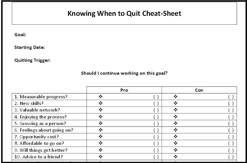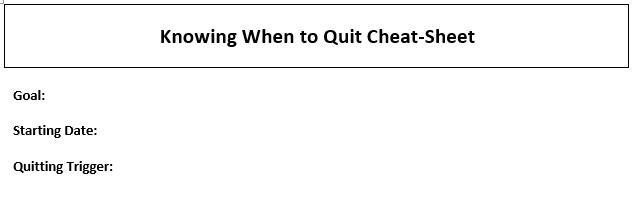 In this post I’m going to share with you a cheat-sheet I developed for knowing when to quit. The process that you’ll be using to fill out the “Knowing When to Quit Cheat-Sheet” is the following: